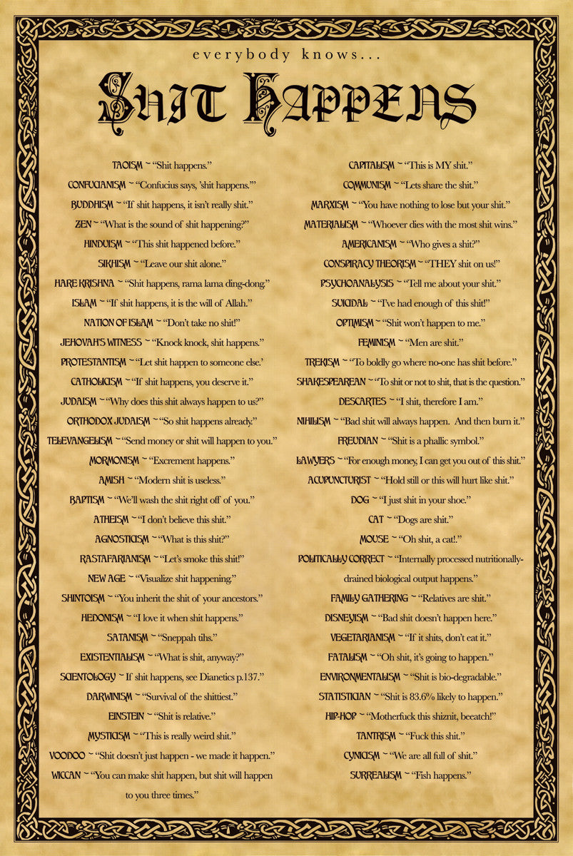 Add to Cart FX1089 SHIT HAPPENS! 24in x 36in - is currently on backorder. You may still purchase now though and we'll ship as soon as more become available.